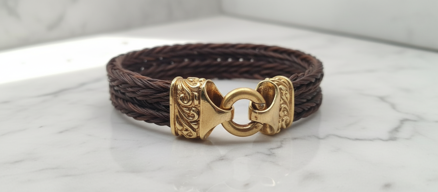 Zeitlose Eleganz in Dunkelbraun – Luxus Pferdehaar-Armband mit Gelbgold