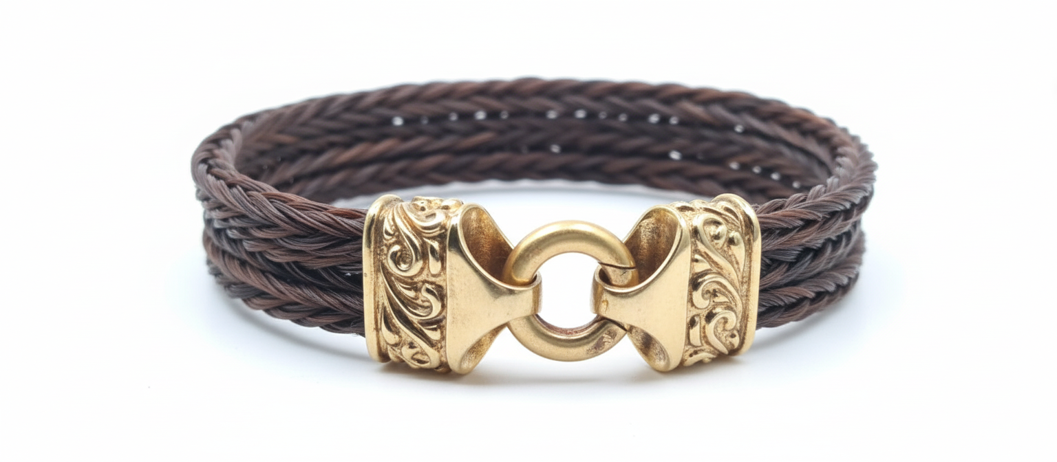 Jedes Armband wird in unserer Schweizer Manufaktur sorgfältig von Hand geflochten. Das mehrsträngige Design aus dunkelbraunem Pferdehaar zeigt die natürliche Farbtiefe und seidigen Glanz des Materials. Der kunstvolle Gelbgold-Magnetverschluss mit filigraner ornamentaler Gravur ist nicht nur ein funktionales Element, sondern ein wahres Schmuckstück für sich.