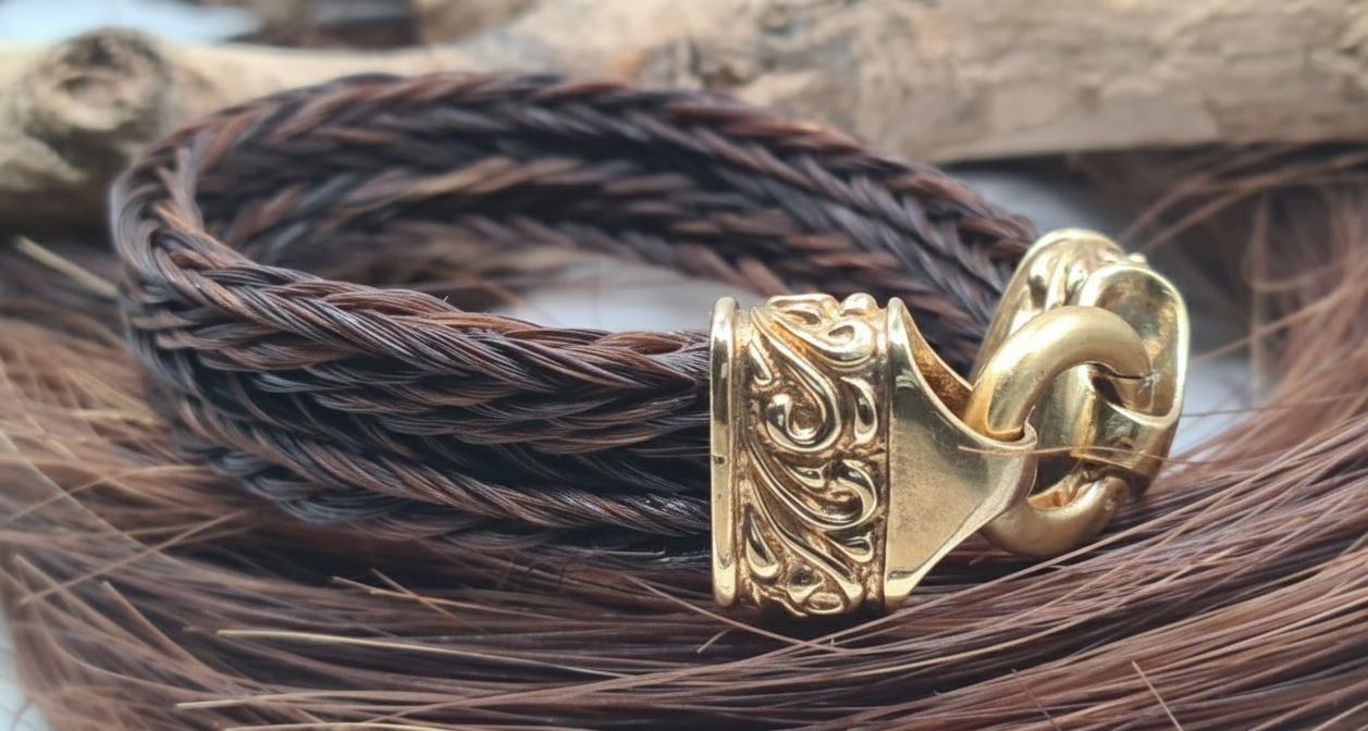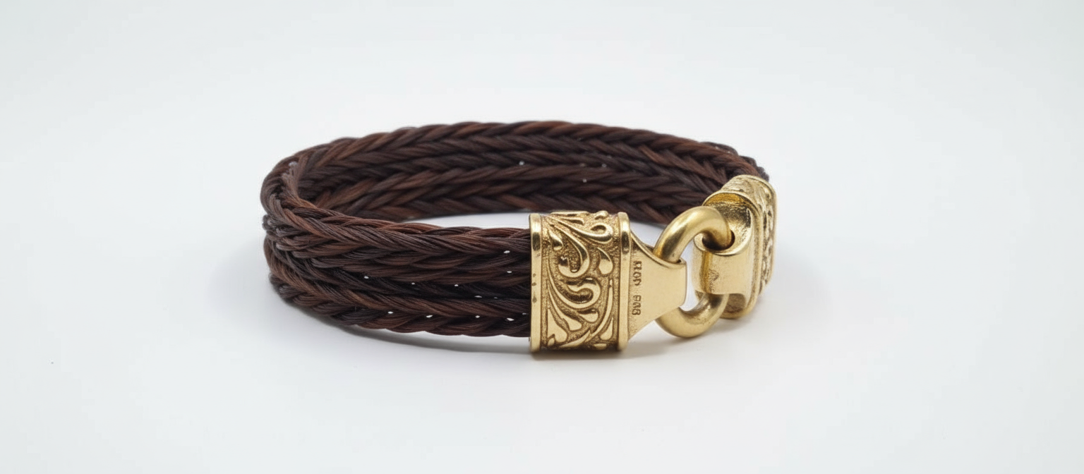 Ein Meisterwerk der Schweizer Handwerkskunst: Dieses exklusive Armband aus echtem Pferdehaar in edlem Dunkelbraun vereint natürliche Schönheit mit luxuriösen Gelbgold-Akzenten zu einem zeitlosen Schmuckstück.