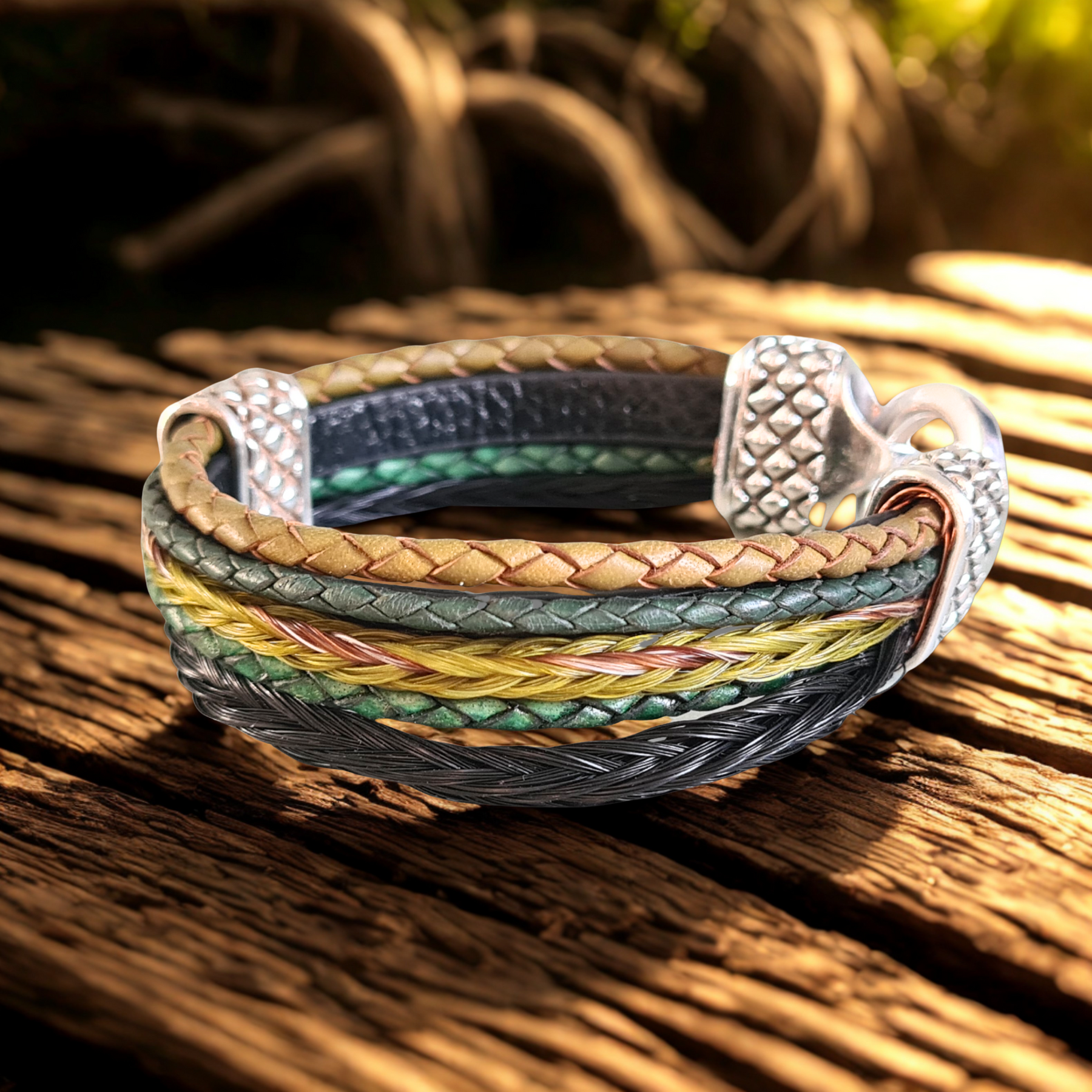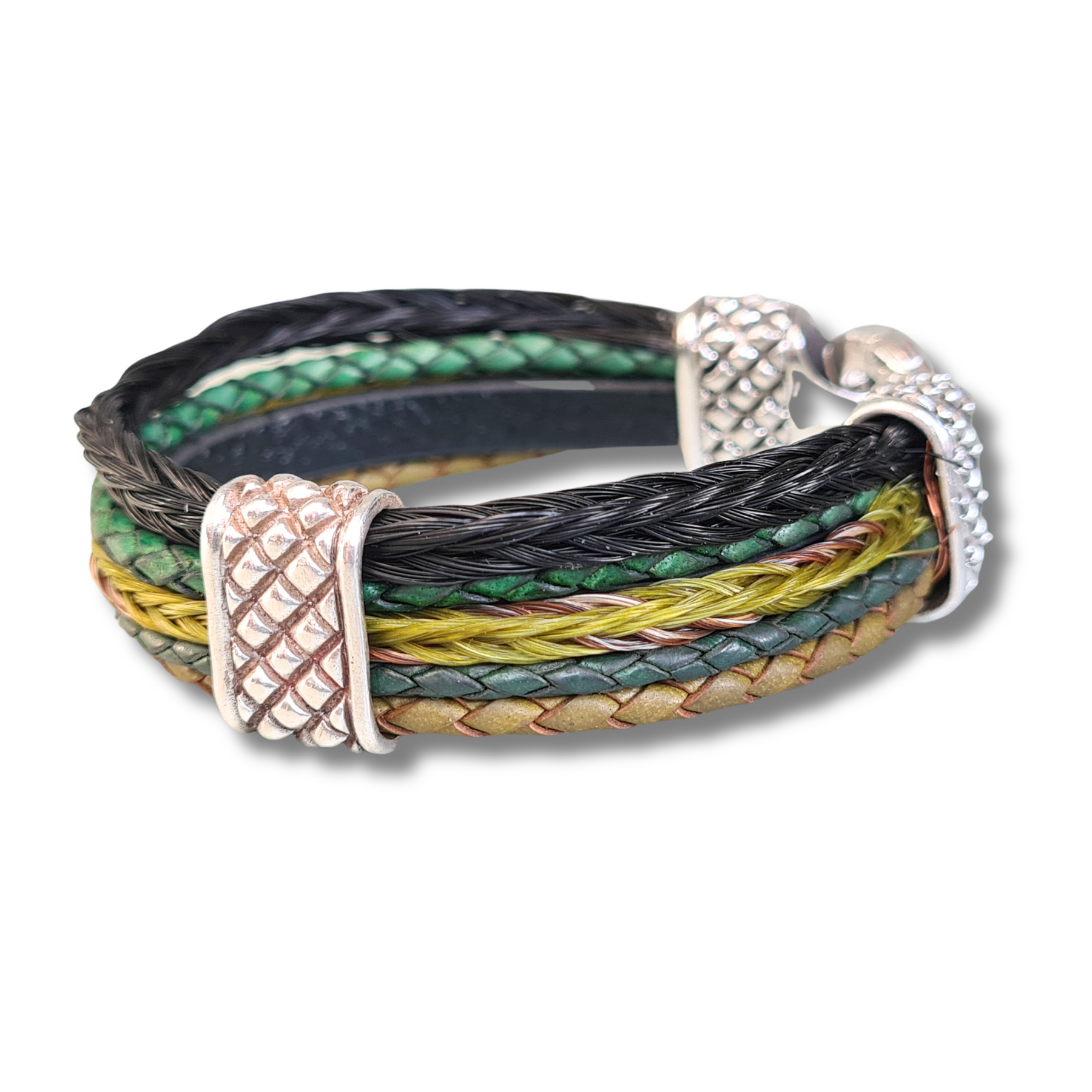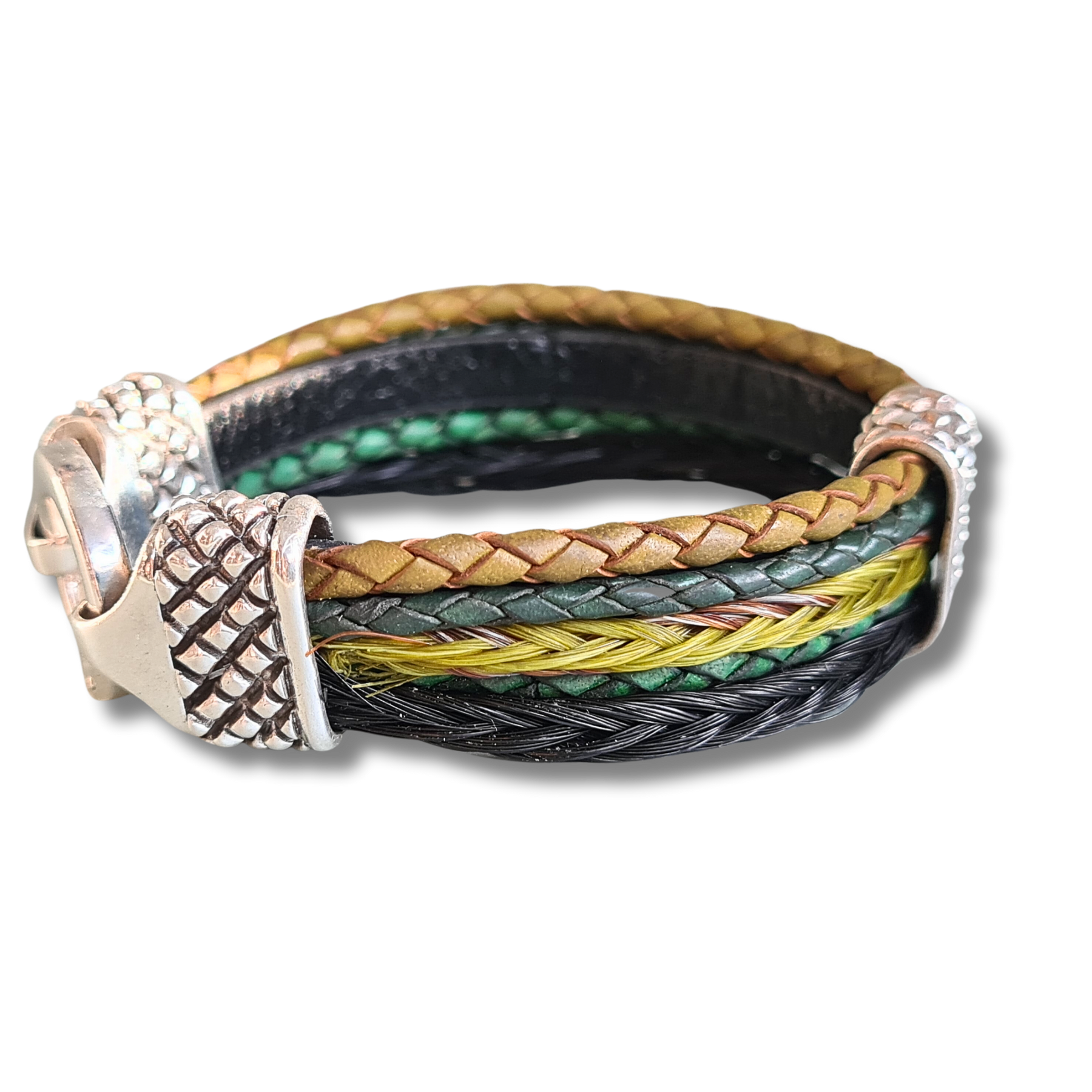 Entdecken Sie die einzigartige Farbkombination unseres hochwertigen Pferdehaarrmbands aus echtem Schweifhaar in Schwarz/Grün mit Sterling Silber Endkappen.