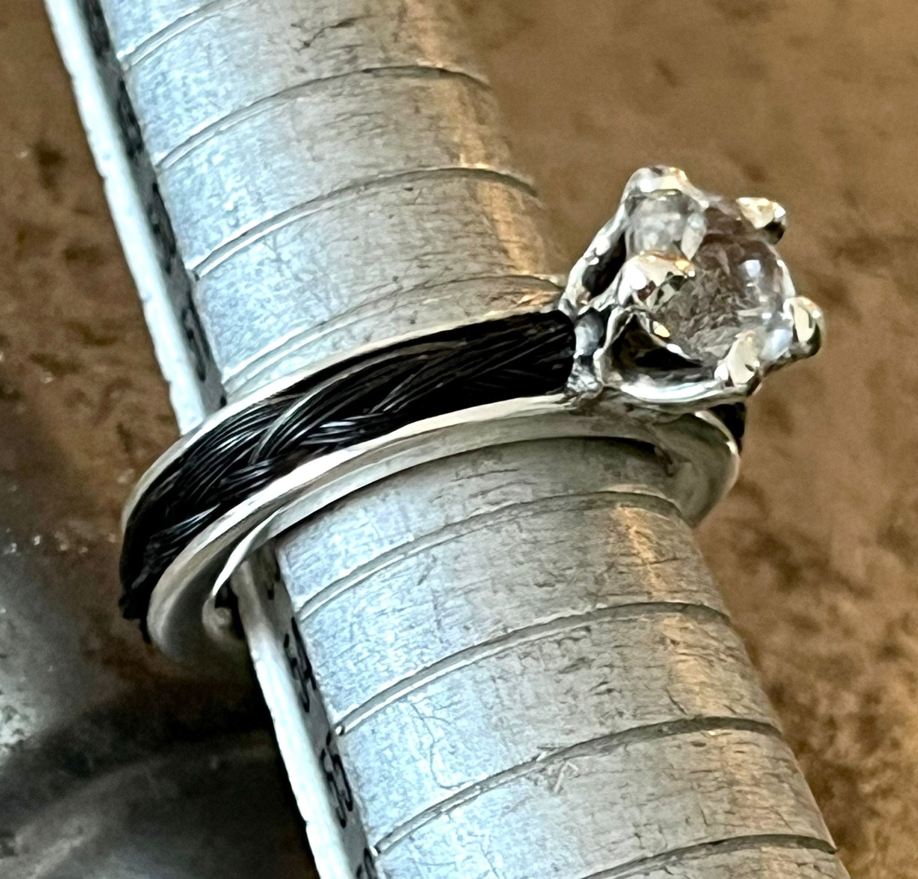 Dieser außergewöhnliche Ring vereint die Reinheit des Bergkristalls mit der natürlichen Schönheit von handverarbeitetem schwarzem Pferdehaar in einer eleganten Fassung aus Sterlingsilber .