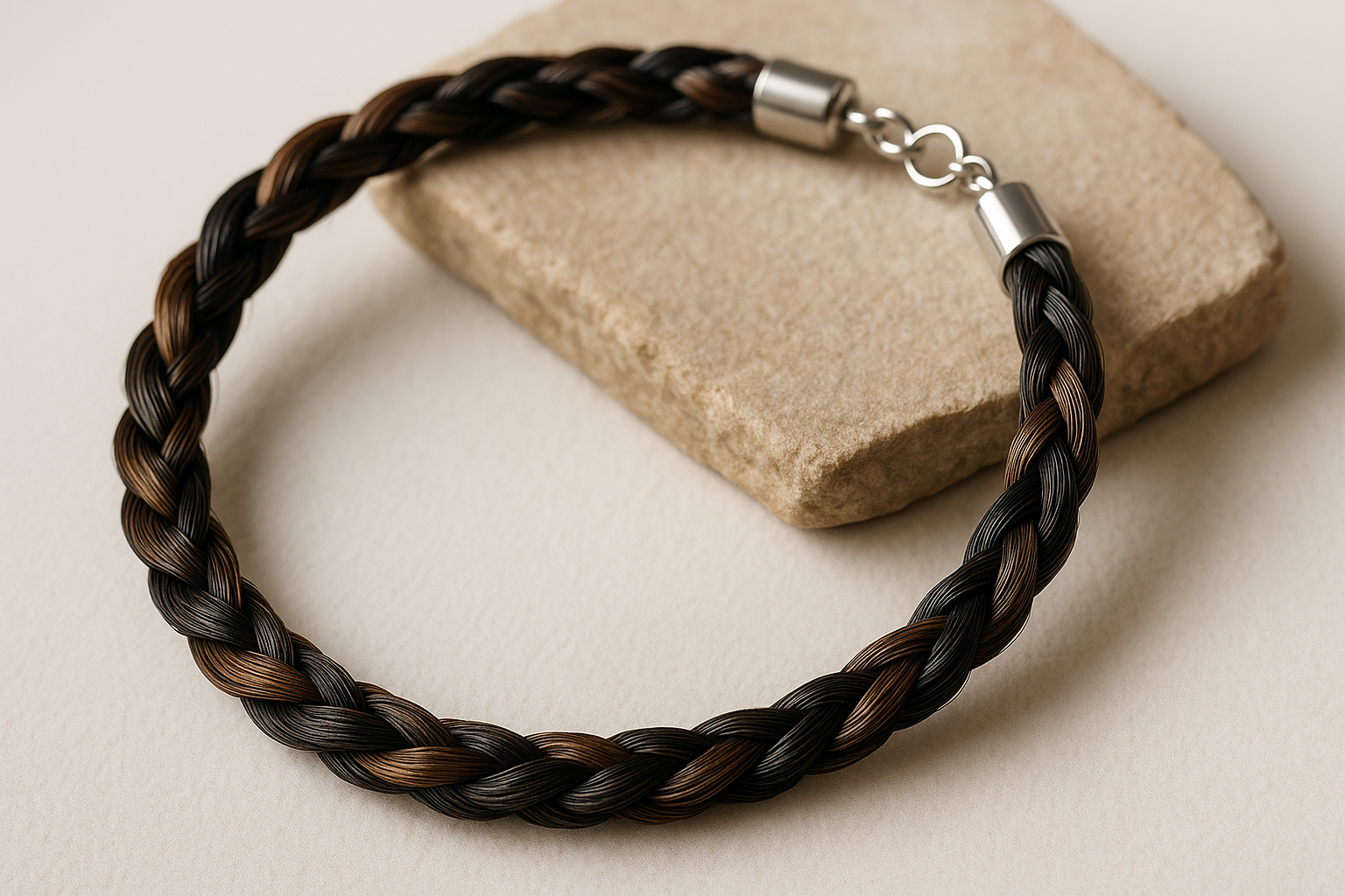 Dieses einzigartige Schmuckstück vereint die traditionelle japanische Kumihimo-Flechtkunst mit der emotionalen Bedeutung von echtem Pferdehaar und einem wertvollen Rubin-Edelstein. Handgefertigt mit 925er Silber.